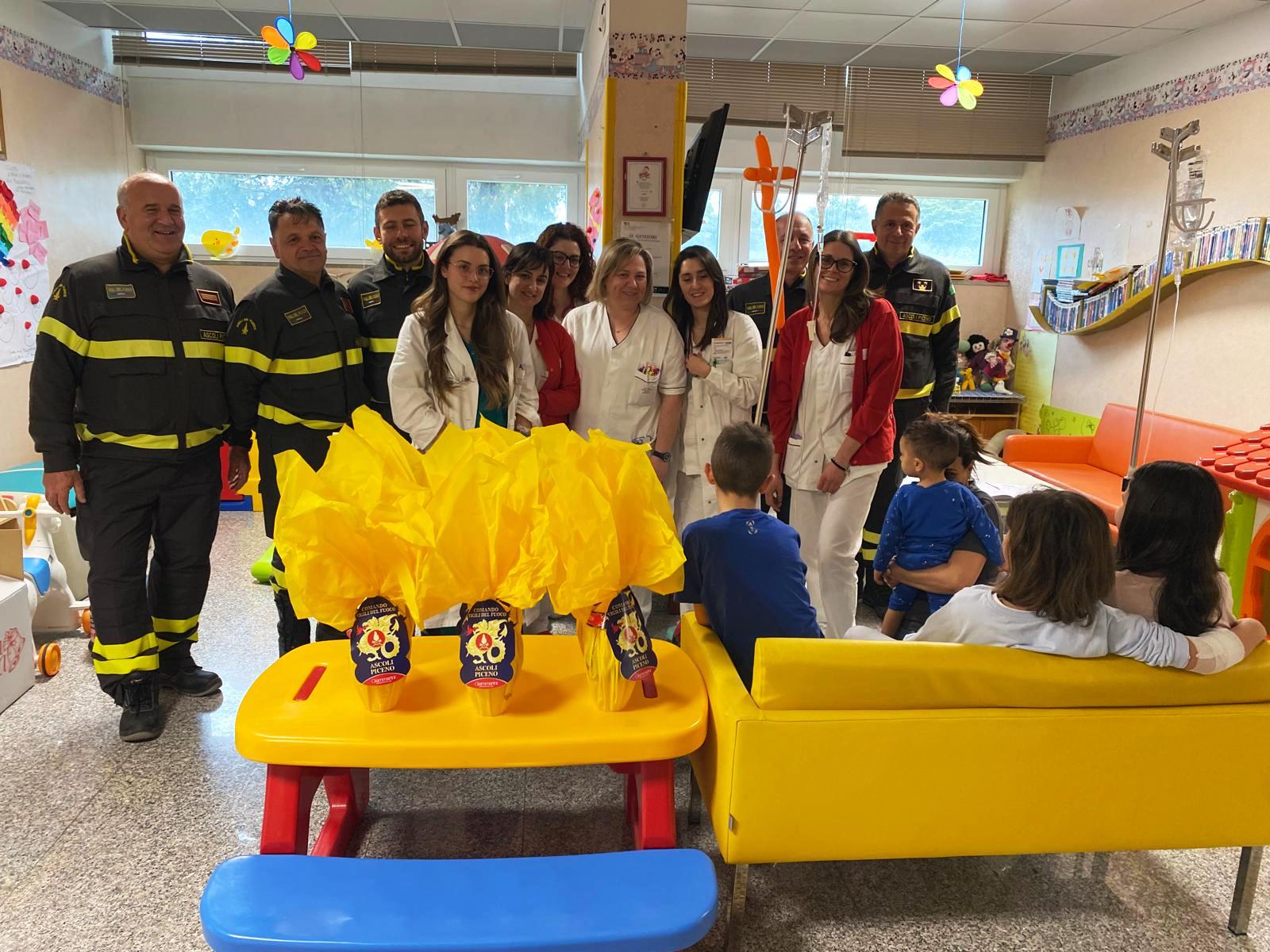 Una delegazione guidata dal Comandante Savino Stallone ha donato a tutti i bambini un uovo di Pasqua realizzato specificatamente per l’occasione dai pompieri piceni. L’occasione è stata propizia per un caloroso scambio di auguri con il personale sanitario ed i genitori presenti, mentre i bimbi scalpitavano per scoprire le sorprese custodite all’interno del dolce scrigno di cioccolata.