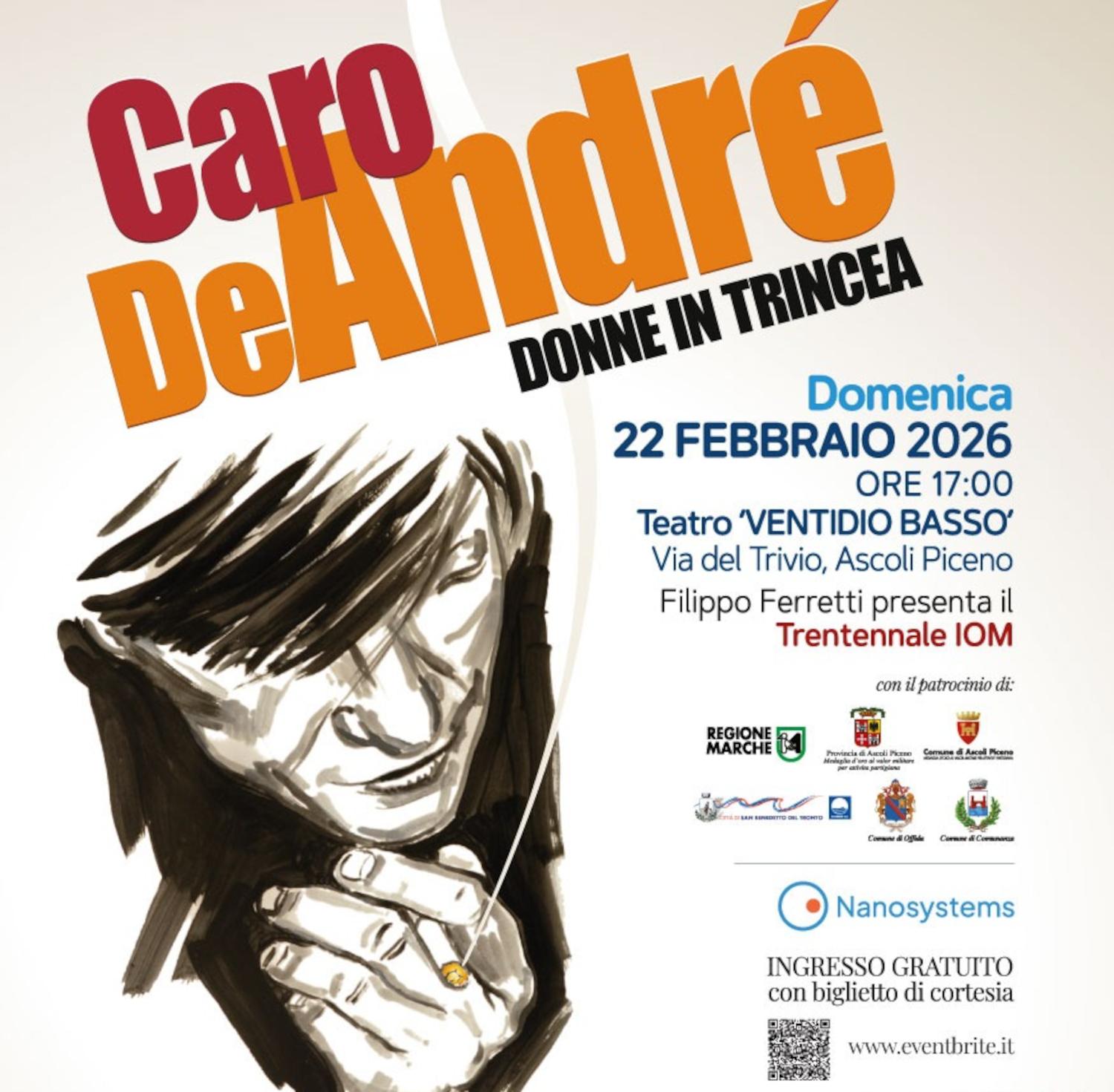 Domenica 22 febbraio si terrà il concerto Caro De Andre’: donne in trincea, la prima manifestazione del trentennale dello IOM Ascoli Piceno OdV ETS. Un evento totalmente gratuito pensato per festeggiare insieme alla comunità, che negli anni ha supportato, sopportato e aiutato l’Associazione.